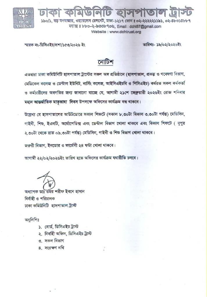 Views Today : 64@Copyright 2025 | All Right Reserved Dhaka Community Hospital Trust | Developed By DCH Trust IT.